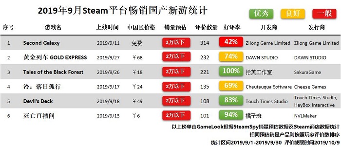 本月国产游戏方面依旧十分惨淡,仅有6款游戏评论数超过100条。其中比较亮眼的是由拾英工作室开发的《(黑森町奇谭)Tales of the Black Forest》,虽然玩法和画风比较小众导致销量成绩仍需发酵,但是游戏100%的好评率也从侧面表现了游戏十分不错的品质和完成度。