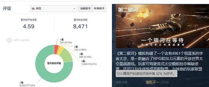 另外值得一提的是紫龙游戏推出的《第二银河(Second Galaxy)》,这是一款支持多端在线、全球同服的科幻题材MMO。目前游戏在TapTap上有50万的预约、评分高达8.3,海外手游版也受到了不少好评。但是反观Steam平台,目前该作获得了314个评价,好评率仅为42%,玩家的矛盾点主要集中在没有对PC操作进行特殊优化以及未能达到同类游戏硬核玩家的心理预期,也有部分玩家纯粹是因为游戏是手游而给出差评。