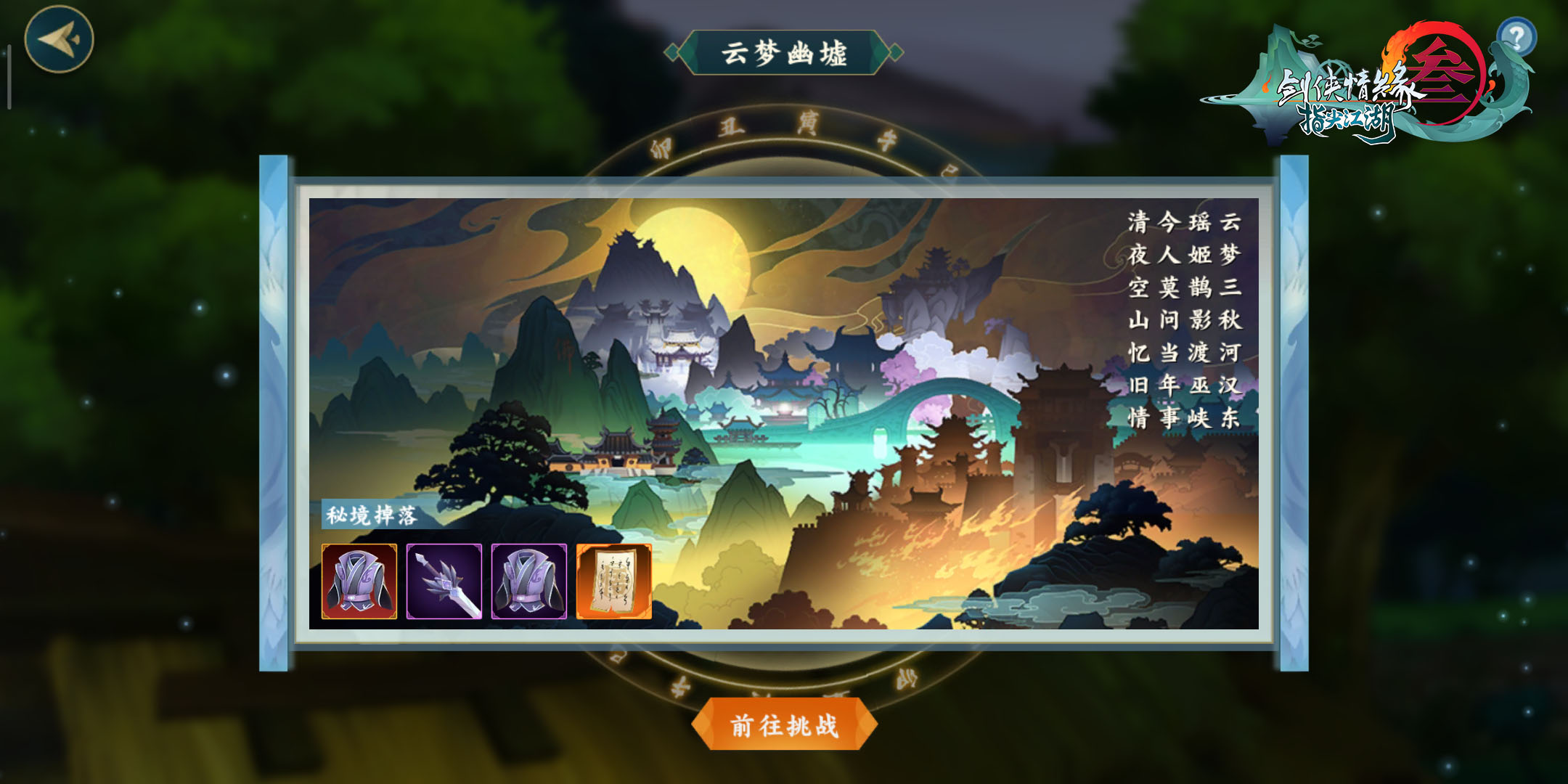 云梦三秋河汉东,瑶姬鹊影渡巫峡。今人莫问当年事,清夜空山忆旧情。全新秘境挑战玩法——云梦幽墟,带领少侠重返梦魇挑战。