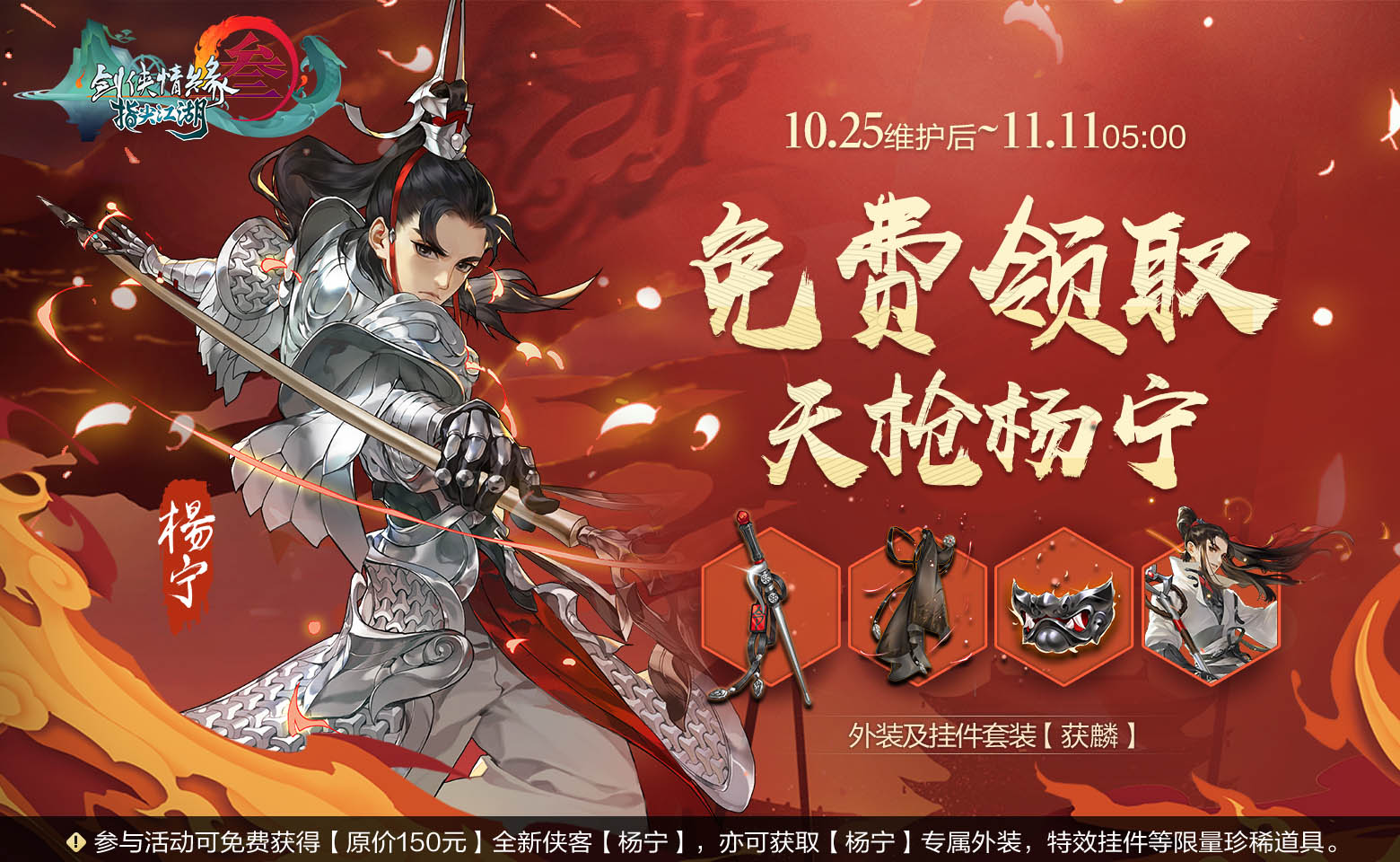10月25日~11月11日期间,登录参与新版本活动亦可获得【枪魄】,可用于免费兑换“原价150元”全新侠客【杨宁】,杨宁特效挂件套装【获麟】、杨宁表现外装【松寒】、寻访道具【天机秘钥部件】。