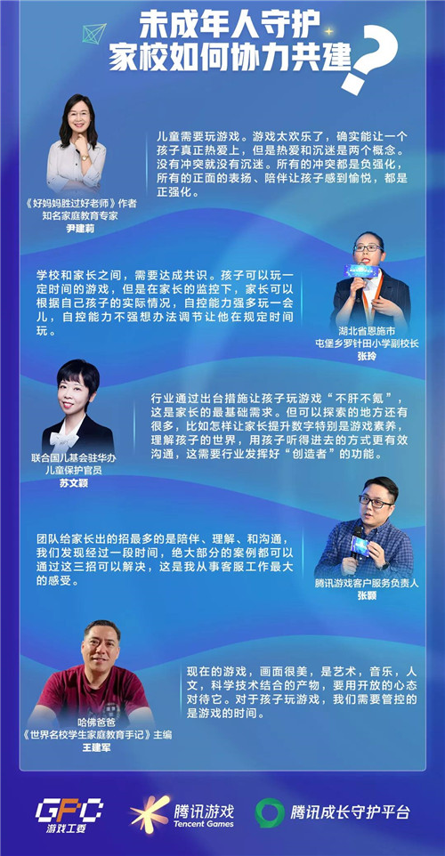 在随后的圆桌论坛上,学校、企业、家庭等各方代表围绕家校协力共建的主题展开了深入探讨。《好妈妈胜过好老师》作者、知名家庭教育专家尹建莉认为,家庭冲突是影响孩子游戏沉迷的重要原因,没有冲突就没有沉迷;湖北省恩施市屯堡乡罗针田小学副校长张玲通过学校管理的个案,建议家长和学校达成更多的共识;哈佛爸爸、《世界名校学生家庭教育手记》主编王建军分享了自己独到的“散养”观,他认为,应该激发孩子的好奇心,让他产生自驱力,有了自驱力就自然有了严格的时间管控能力;腾讯游戏客户服务负责人张颢分享了团队帮助个体家庭保护未成年人的经验;联合国儿基会驻华办儿童保护官员苏文颖则充分肯定了中国在未成年人保护方面的探索,她表示:“在国内,我们的监管方和行业的目标是一致的,一些政策的出台和落地速度也非常快。”