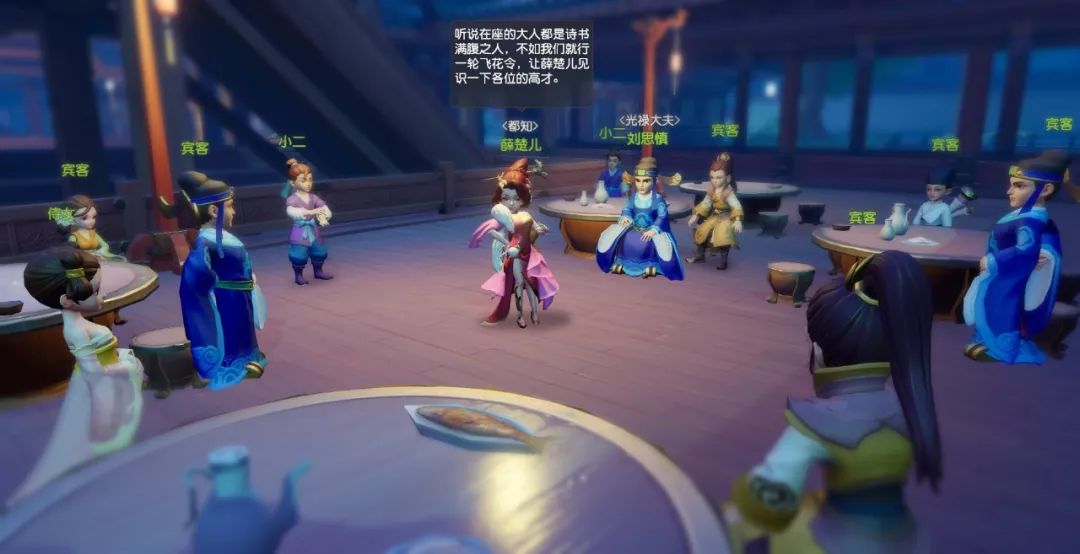 光有趣味人物还不够,一个灵动有生活气息的三界还需要精彩的“事”,大事小事让三维版更有古风色彩。比如说长安“都知”附近有的“飞花令”供玩家体验玩法,其来源就是唐代的行酒令文化。“飞花令”得名于唐代诗人韩翃《寒食》中的名句“春城无处不飞花”,是文人墨客喝酒助兴的特有玩法。
