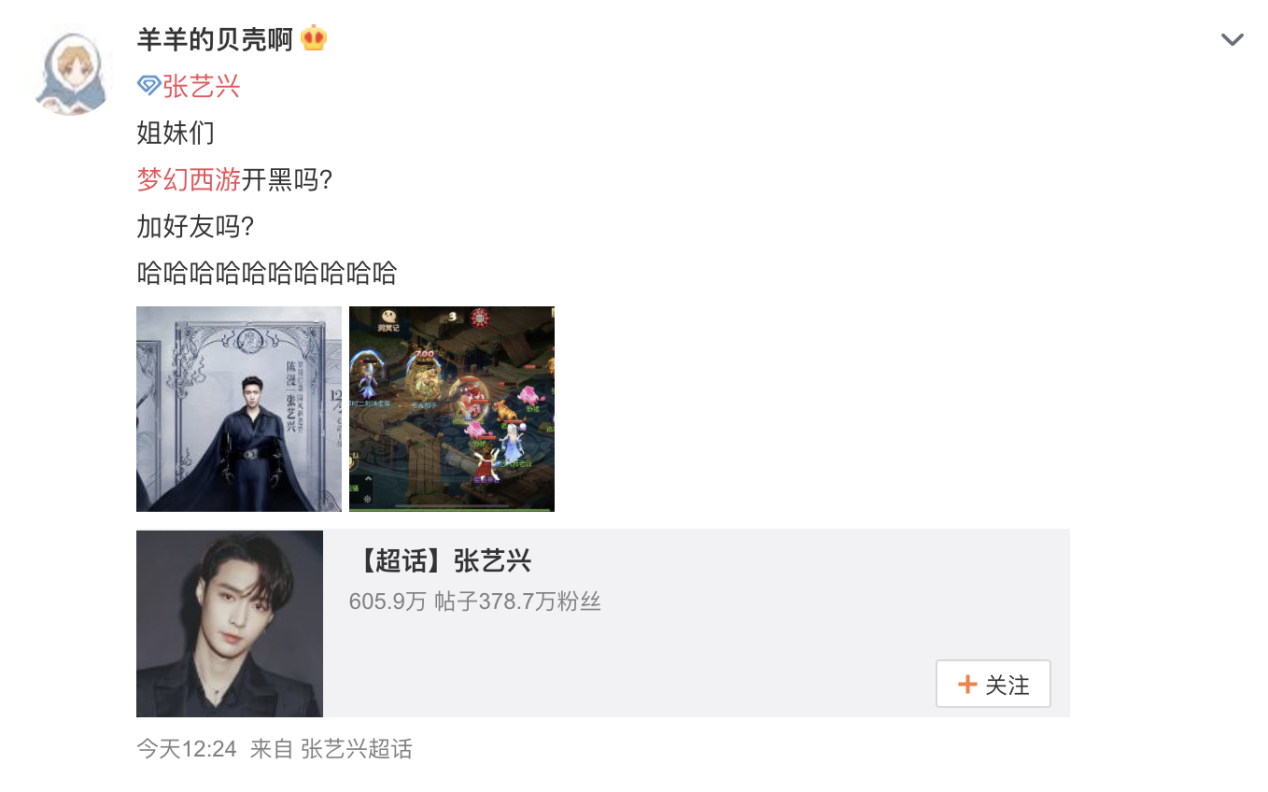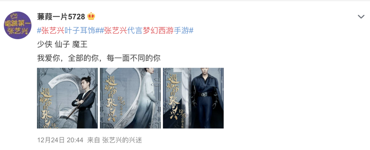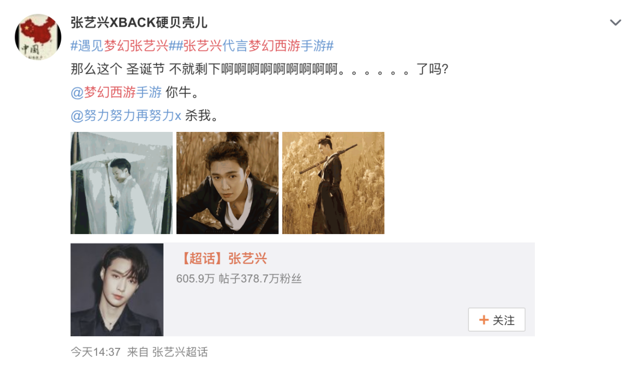 张艺兴自去年十月起出任《梦幻西游》手游(后文称梦幻手游)代言人,就被粉丝称为是“命中注定的代言”。在饭圈文化里,偶像的一举一动都是焦点。张艺兴是梦幻西游的铁粉,自然也就成为了粉丝津津乐道的话题。