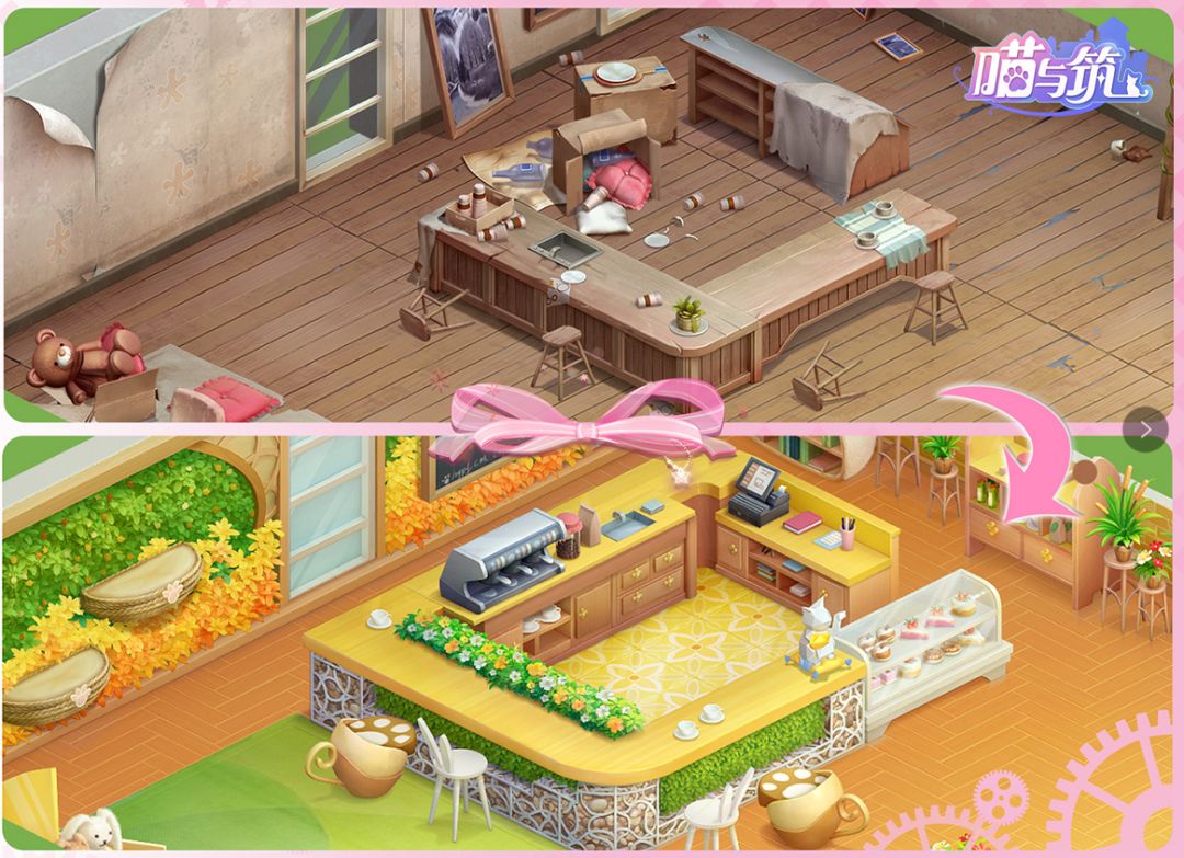 不同于常见的玩法组合模式,在《喵与筑》中的消除类玩法是养猫、家居建设、剧情推动的收束点。也就是说,玩家想要收集更多的宠物猫,需要通过消除关卡的挑战,同时这也推动着故事剧情和家居场景的发展。这一设计在消除类手游中比较少有,更多见于MMORPG或者ARPG等大体量手游中–将不同的游戏模组成体系地交互关联,有利于推动玩家更积极地探索分支玩法,也强化了游戏剧情在流程中的展示。《喵与筑》的这套体系设计在消除类手游中可以说是非常独特,并且让玩家耳目一新的。