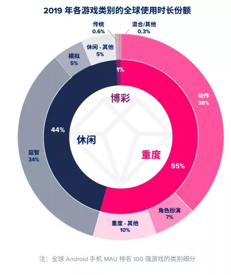 · 重度游戏中,动作游戏占据最长的使用时长。2019年,《PUBG MOBILE》是Android手机全球使用时长排名第一的动作类重度游戏。