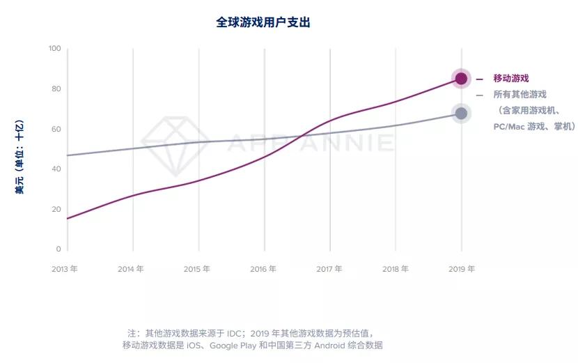 · 2019年全球移动游戏用户支出超过 PC/Mac游戏2.4倍,超过家庭主机游戏的2.9倍。