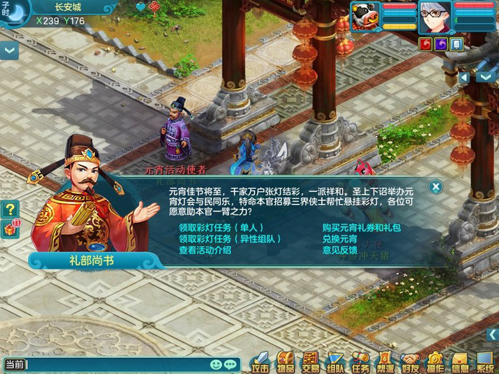 同时,点挂元宵彩灯后,答对彩灯上的灯谜可获得元宵积分和元宵礼券,大家也可以通过元宵礼券在“礼部尚书”处兑换元宵,每个玩家每天可以领取彩灯任务10次以及20次的猜灯谜机会。