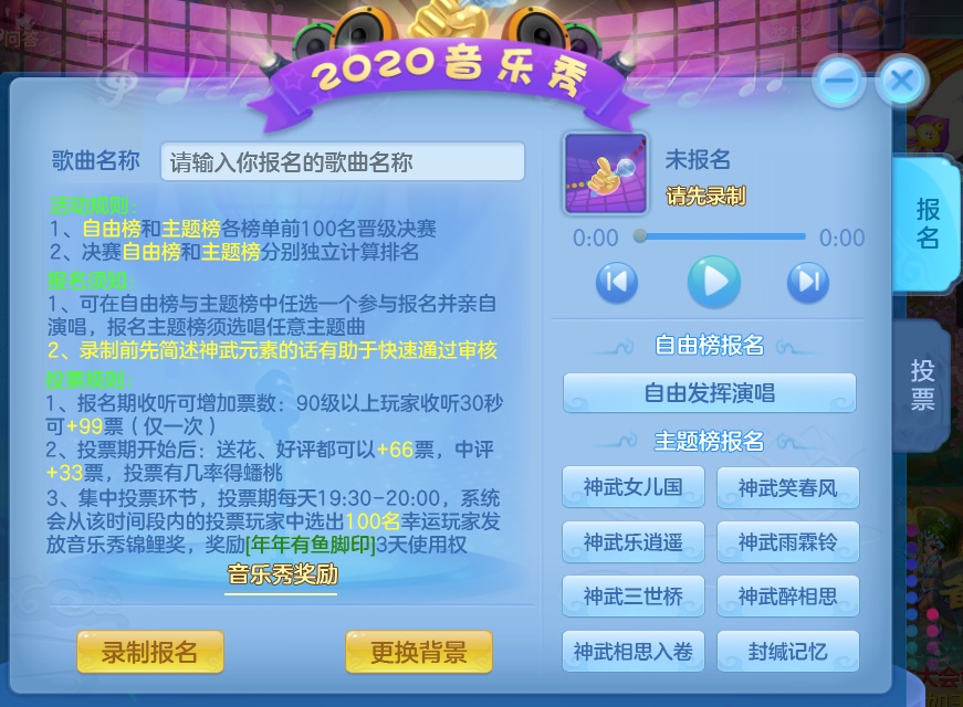 同时,“2020音乐秀”还推出了神武主题曲试听功能、集中投票选取音乐秀锦鲤奖等丰富内容,海选以及决赛投票期间,每日19:30至20:00为集中投票时段,系统将从这段时间投票的少侠中选出多名幸运儿并为其上“2020音乐秀”锦鲤奖。