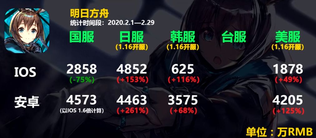 《明日方舟》在2月的主要收入海外市场依然是日本、韩国和美国,分别占比46.8%,21.7%和17.9%;其海外总收入是中国iOS的6.7倍。截至2月29日,该游戏在日本的RPD(每下载付费)为26美元。