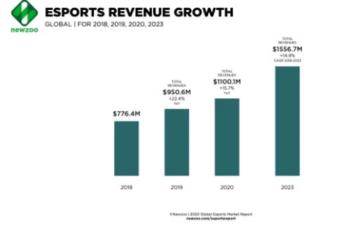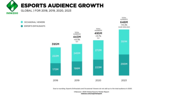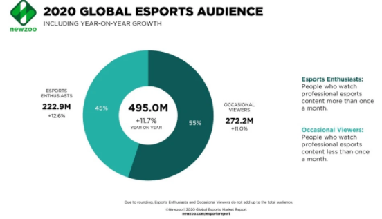 受众方面,Newzoo称在2020年,全球电竞观众将会增长至4.95亿,其中电竞爱好者(平均每月观看电竞赛事超过一次)人数约为2.229亿。