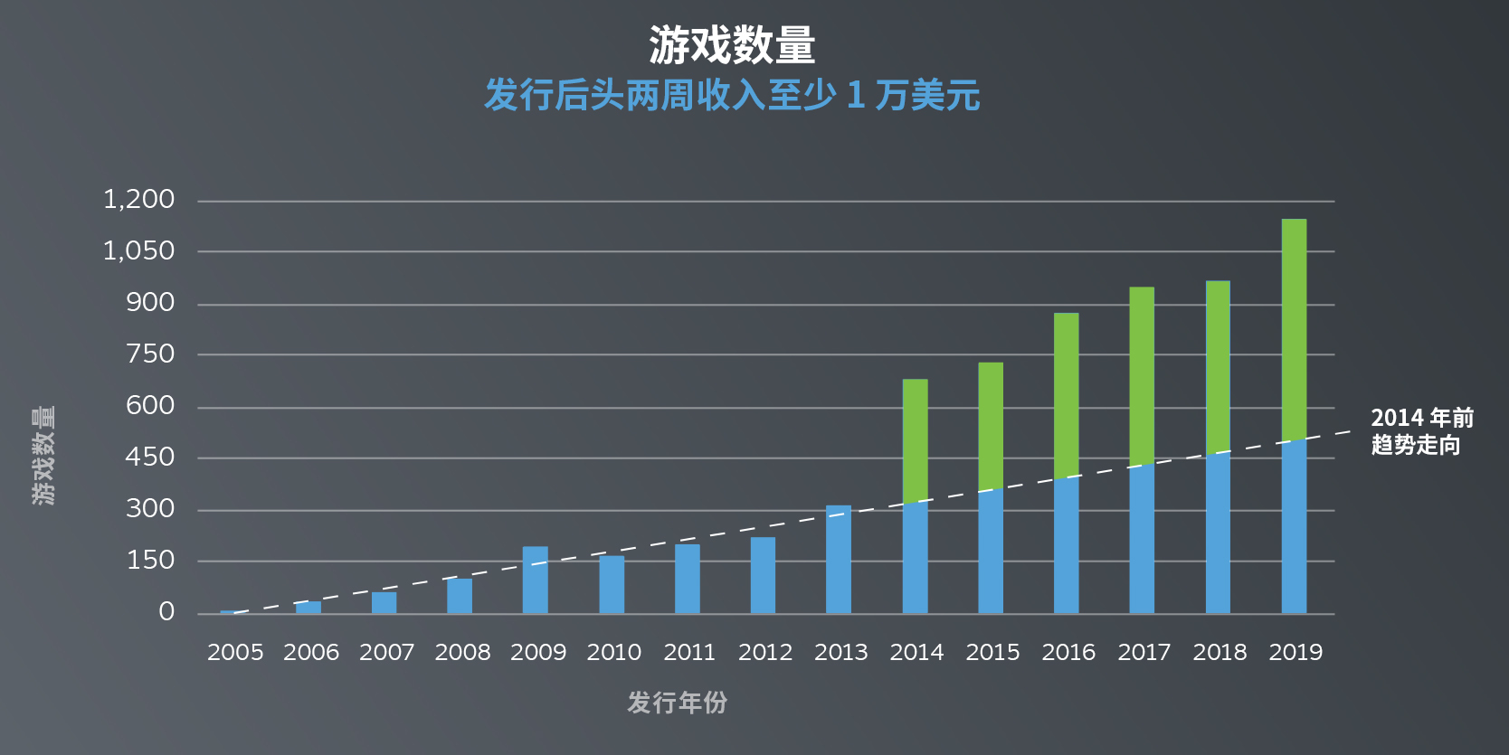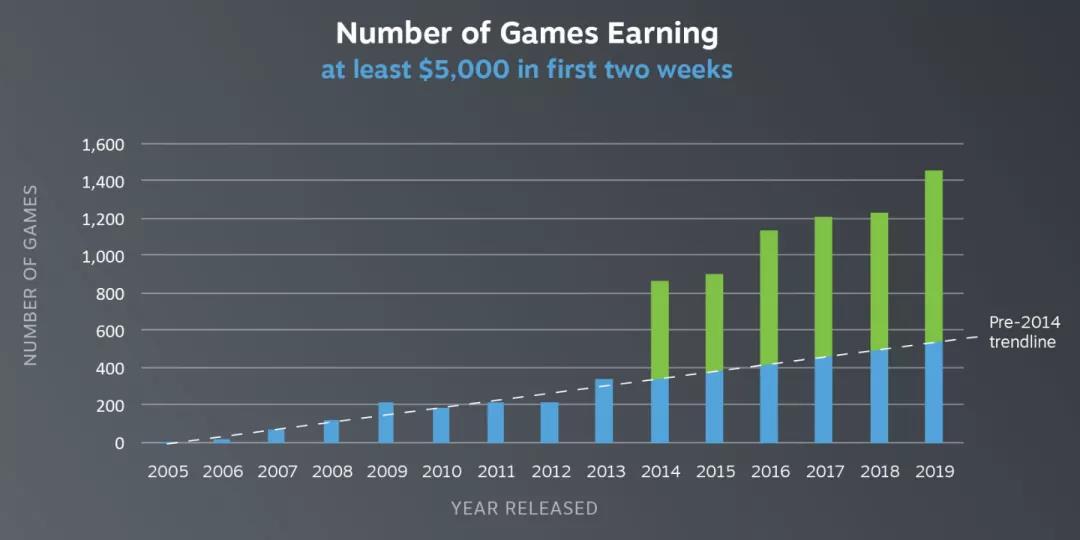大家可能还注意到了图表上 2013 年与 2014 年之间出现的大幅攀升。 这反映出我们自2013年8月起在 Steam 上所接受的游戏数量的增长。 这其中许多游戏并未立即准备好发行,因此这一增长的效应仅在2014年才真正开始显现。比起2013年,2019年有超过3倍的新品达到了1万美元的基准。