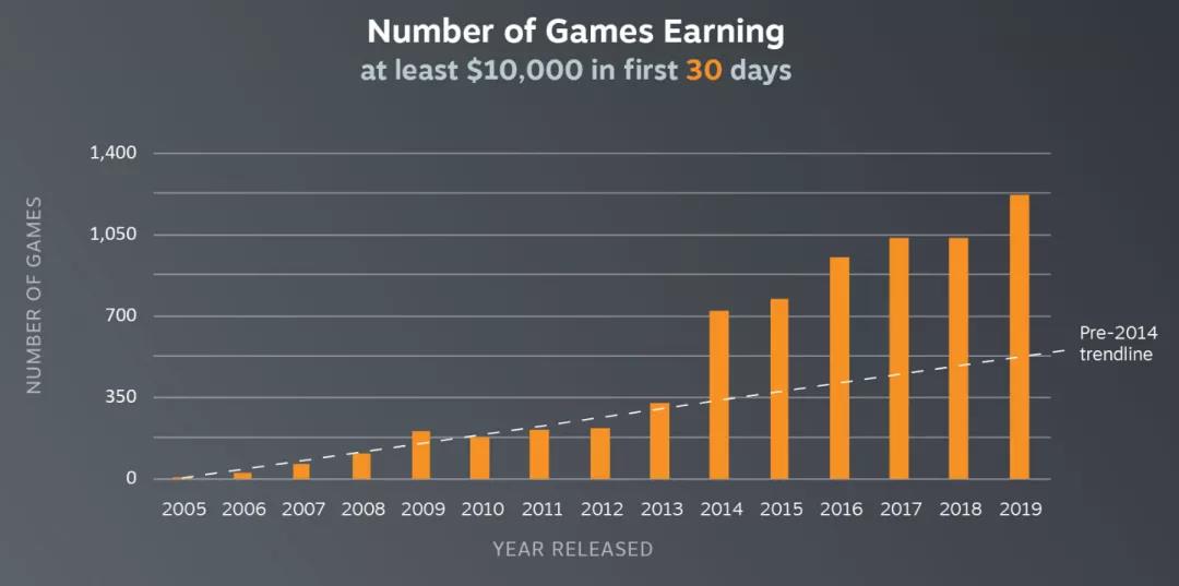 1万美元的门槛是个相当随意的起点,为了确保分析结果并非偶然,我们同时也测试了更高和更低的门槛以及不同的时间范围。在各种情况下,我们都发现了相似的规律。 举例来说,2019 年发行头两周收入超过 5000 美元的游戏数量是 2013 年的 4 倍还多,收入超过 25 万美元的新游戏则是 3 倍多。 大家可以在我们的研究说明中找到此基准和其他基准的相关图表。