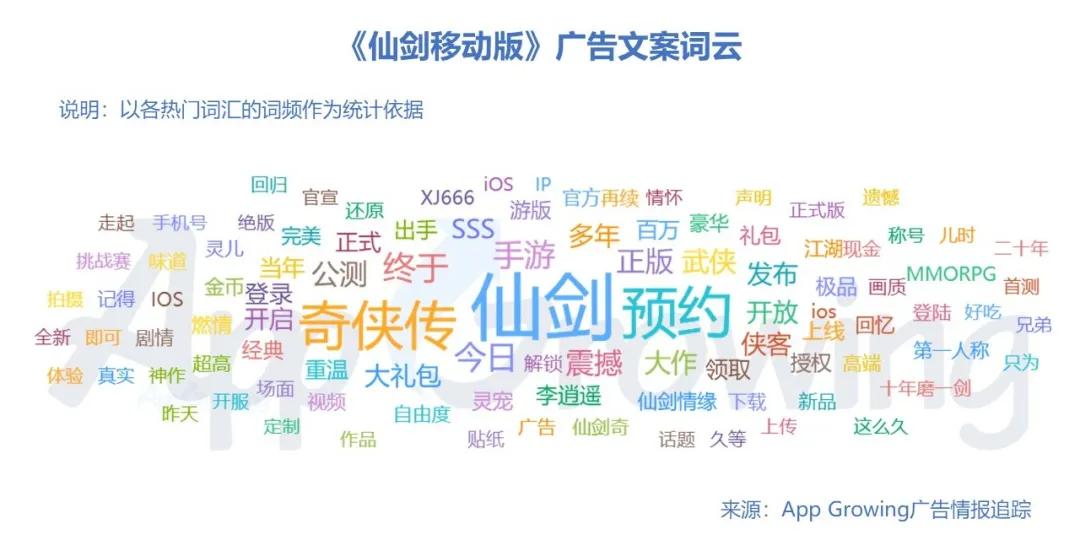 从该手游的词云图来看,《仙剑移动版》在文案方面强调“仙剑”、“预约”、“奇侠传”、“正版”、“多年”等卖点,突出重点突出仙剑IP。