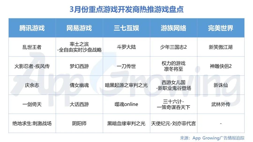 App Growing根据广告投放数整理出3月份5大重点游戏开发商的热推手游如下。