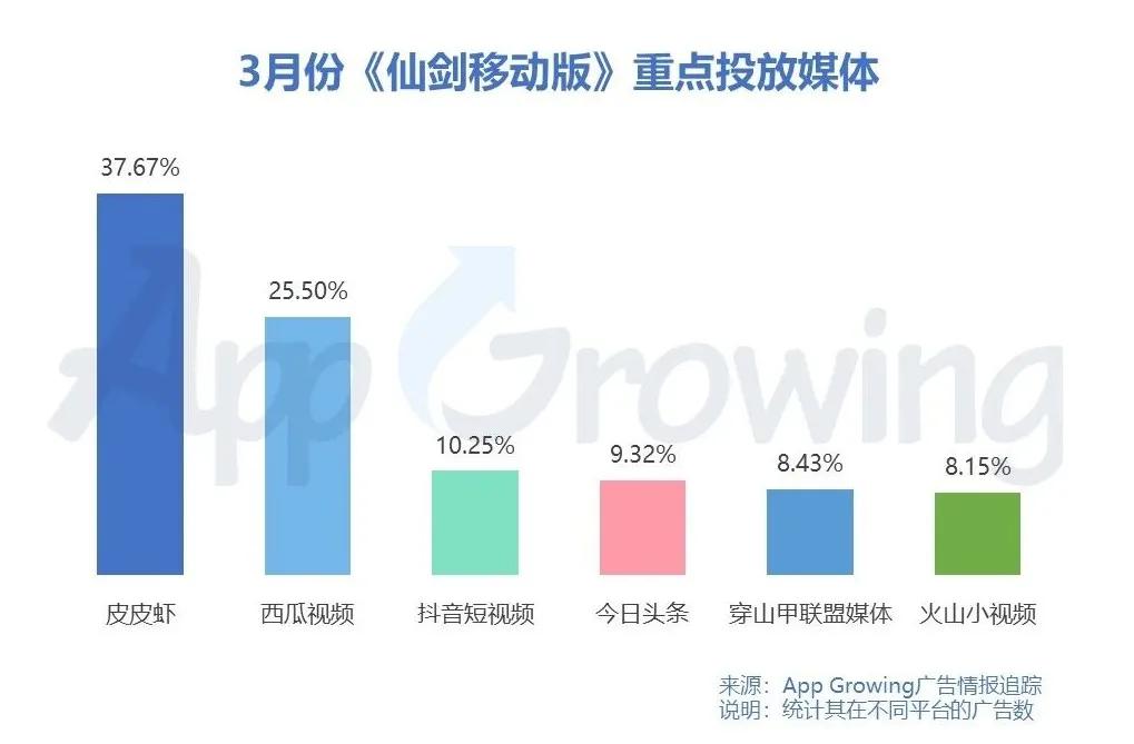 《仙剑移动版》在3月重点投放巨量引擎平台,占比高达99.15%,广告媒体主投皮皮虾、西瓜视频、抖音等等。
