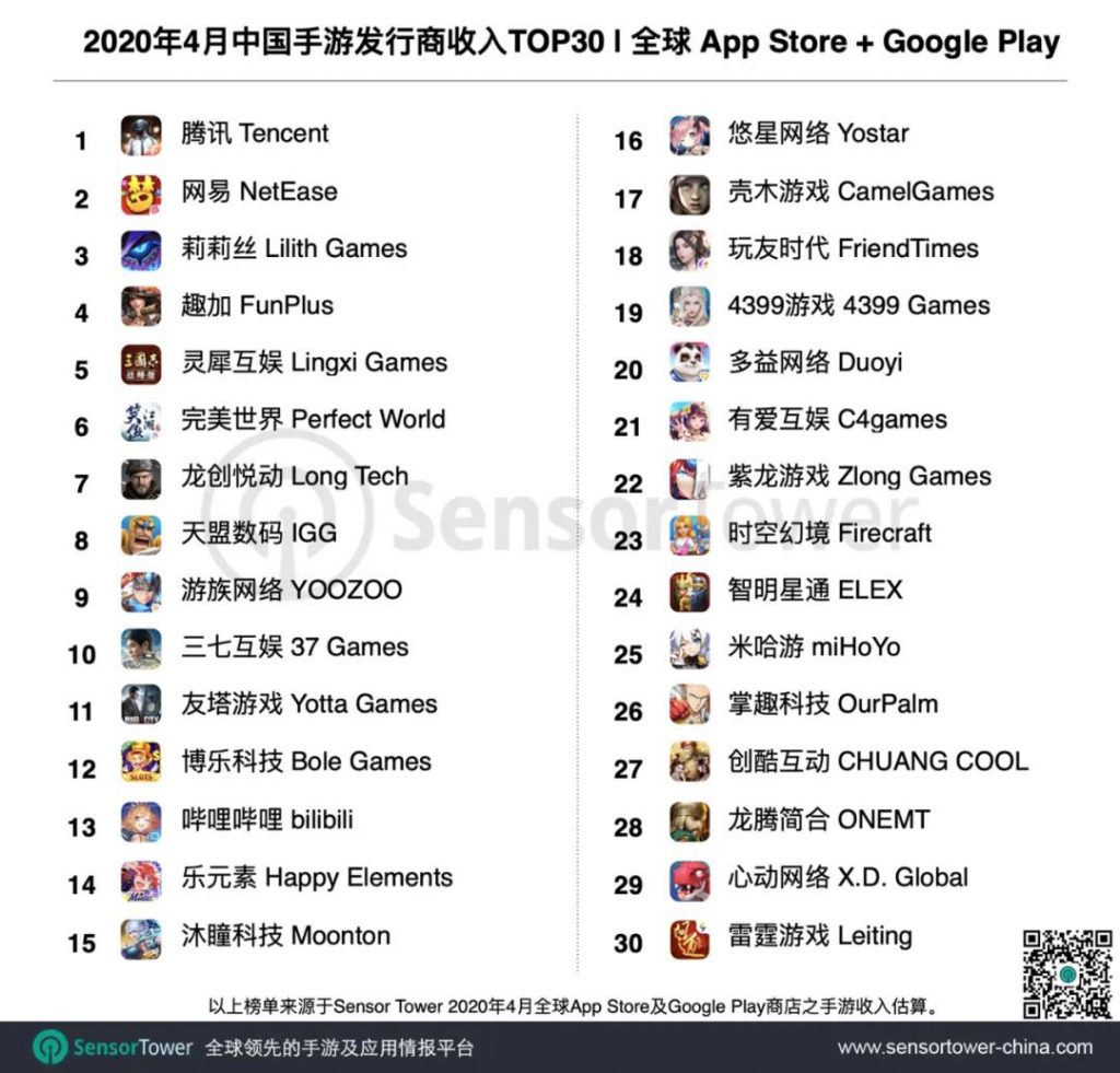 Sensor Tower商店情报平台显示,2020年4月中国手游发行商在全球 App Store 和 Google Play 的收入排名。榜单中30个手游发行商4月全球吸金超过17.4亿美元,较上期增长6.7%,占当期全球手游总收入27.5%。