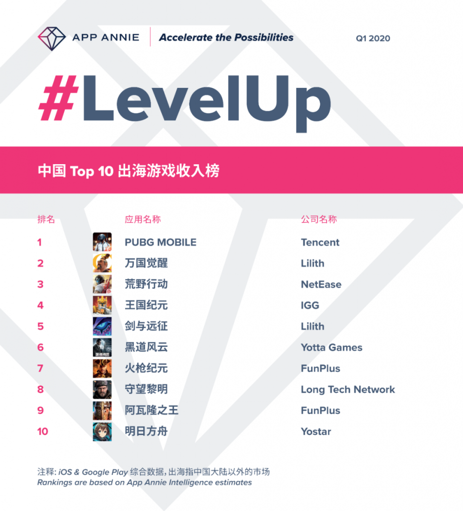 App Annie 发布 2020 年一季度中国游戏出海收入前十强。收入统计商店包含 iOS 与 Google Play,统计市场为全球除中国大陆以外市场。