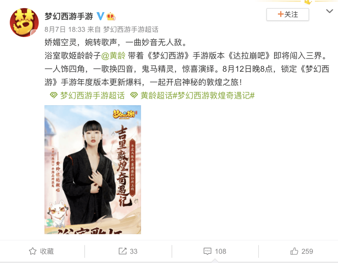 实际上,这是《梦幻西游》手游配合暑期敦煌新内容的传播,而展开的诸多尝试之一。在当晚的发布会上,从金子涵的元气国风舞蹈《我的成人礼》到”转音歌姬”黄龄压轴献唱的梦幻版《达拉崩吧》,都恰到好处地与新版本的内容达成互文的营销效果。这种动漫+演艺节目的创新传播模式,赢得了玩家和业内的一致好评。
