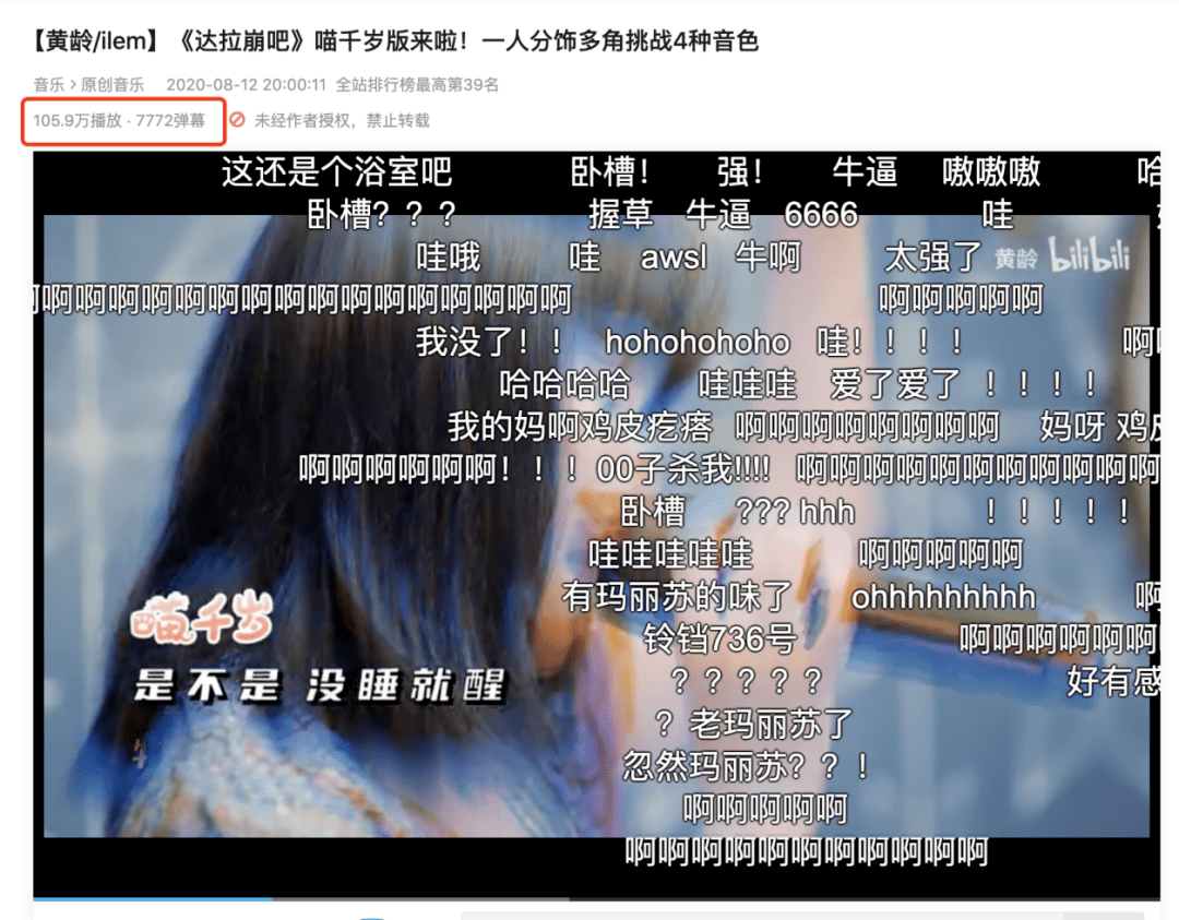 而在 b 站,梦幻版《达拉崩吧》一经发布便迅速收割人气,制造了一场弹幕狂欢,网友对黄龄的精彩演绎纷纷点赞。截至目前,该 MV 的播放量已经逼近 110 万,数据仍在持续增长中。