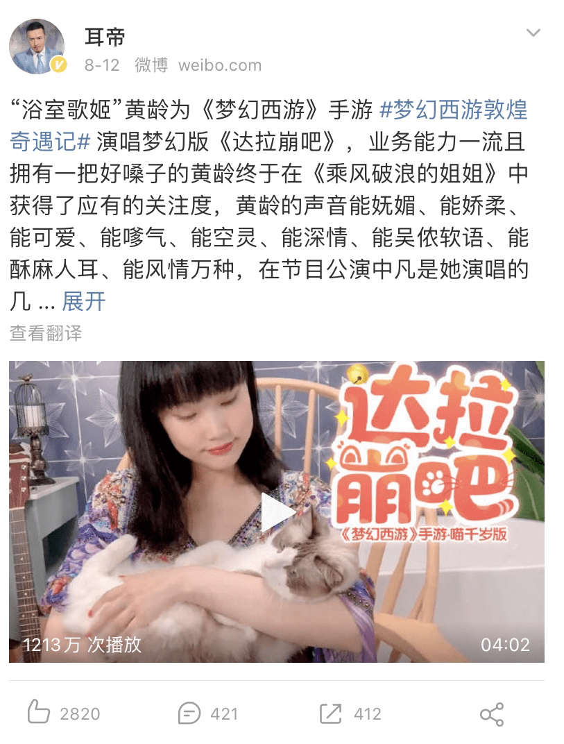 黄龄献唱的梦幻版《达拉崩吧》凭借魔性洗脑的曲风,在微博迅速蹿红。同时还得到了耳帝、“音乐怪人”等音乐 KOL 的力挺。其中耳帝对黄龄精彩多变的演绎赞誉有加,称其声音“风情万种”,也从侧面强化了喵千岁的人设。