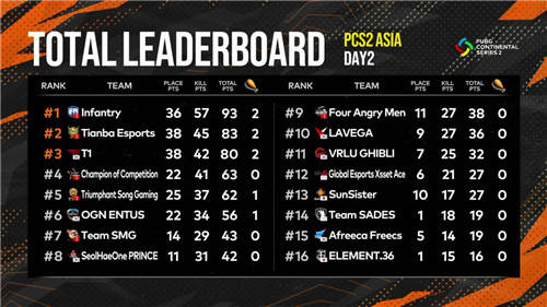 PCS2东亚洲际赛率先开始第一周的赛程,经过两天总计8场比赛过后,PCL赛区展现了强大的统治力。其中2020PCL夏季赛冠军iFTY战队延续火热手感,以总分93分高居榜首;同样来自PCL赛区的天霸战队凭借稳定的发挥,以10分之差位居第二;来自PKL赛区的T1战队是排名前五中唯一一支非PCL队伍,以80分排在第三;第四、第五名分别为PCL赛区的COC和TSG两支战队。首次参加国际赛事的他们“初生牛犊不怕虎”,算是率先站稳了脚跟。其他两支PCL战队,SMG和4AM表现中规中矩暂排在第7和第9位,后续的比赛期望他们冲出重围,争创佳绩。