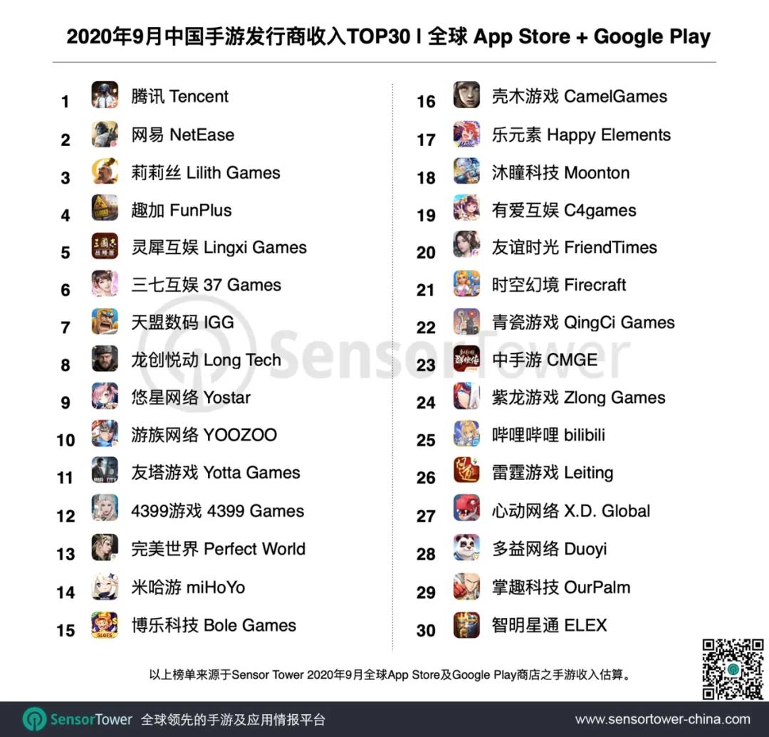 Sensor Tower商店情报平台显示,2020年9月中国手游发行商在全球 App Store 和 Google Play 的收入排名。榜单中30家厂商9月全球吸金19.2亿美元,占当期全球手游总收入28.8%。