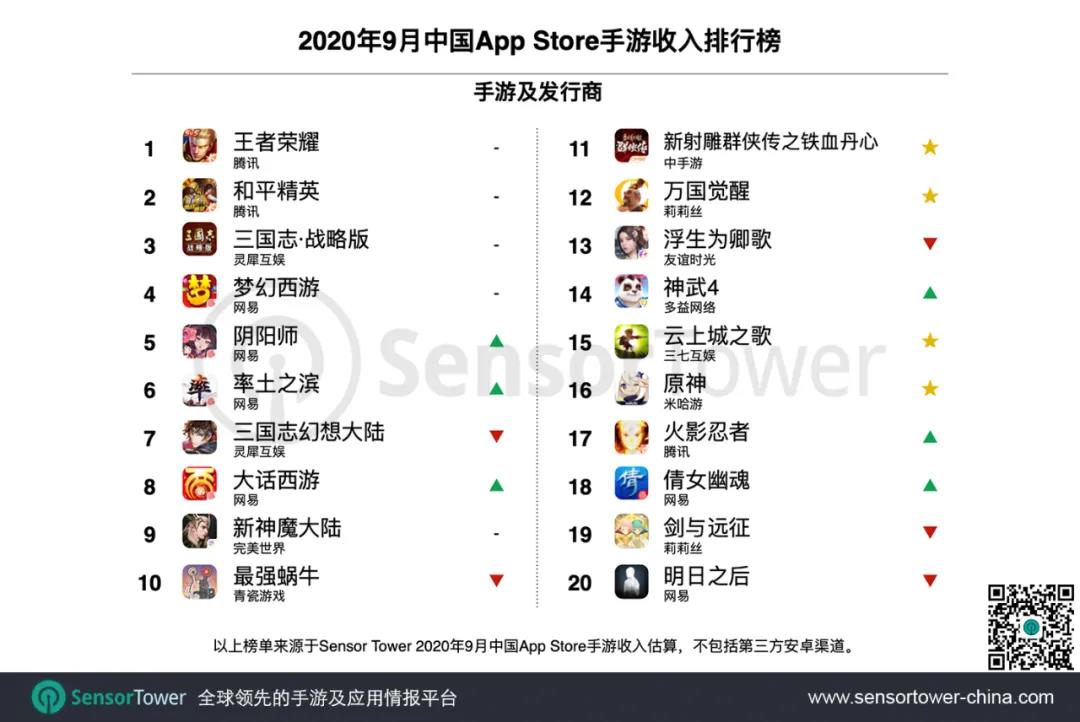 今年暑假中国手游市场略显平静,但进入9月中国苹果商店手游收入榜迎来4款产品新晋榜单。随着《万国觉醒》,《原神》等新品在国内运营进一步深化,中国手游市场的竞争格局和榜单头部有望出现新的变化。