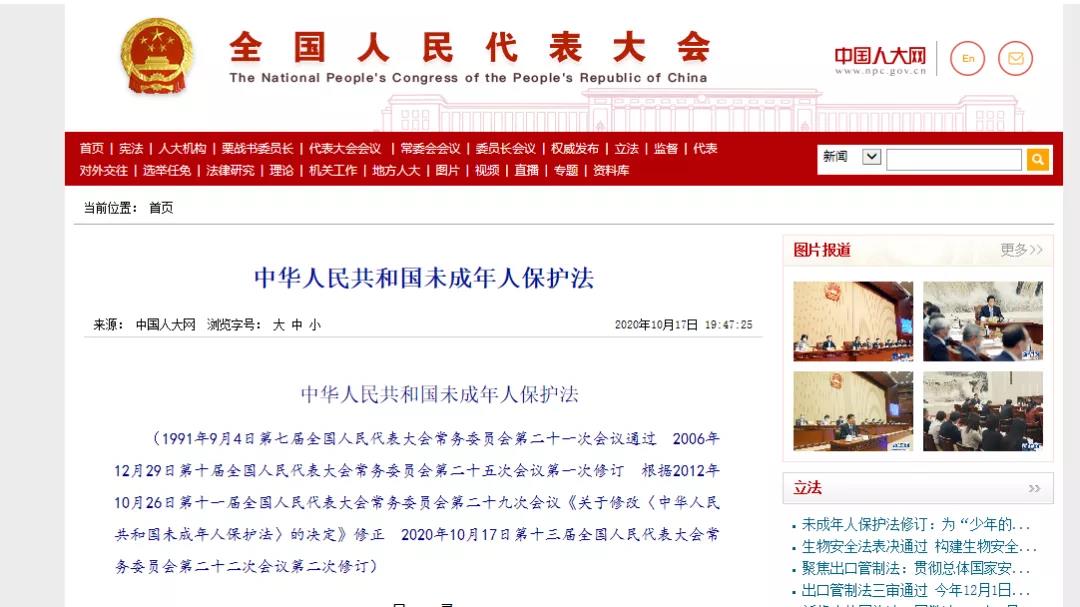 10月17日,人大会议修订《中华人民共和国未成年人保护法》,自2021年6月1日起施行 。