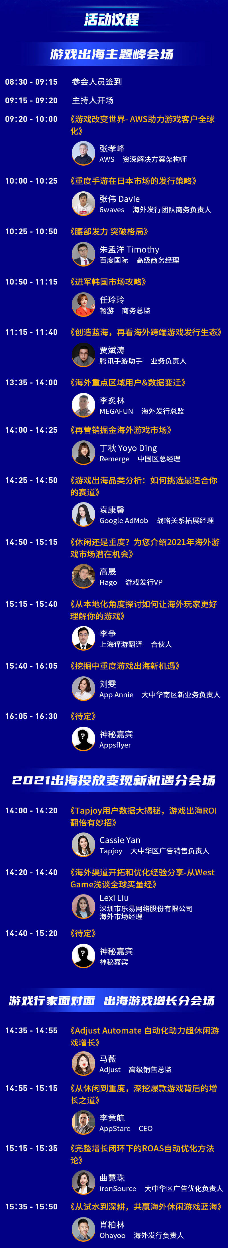为助力企业完成“国际化”出海业务,大会诚邀游戏行业领头人物到场分享出海前端信息,针对全球重点出海区域现状,解读出海热点话题和国际政策,助力开发者更好的理解海外市场,解决各类出海难题。