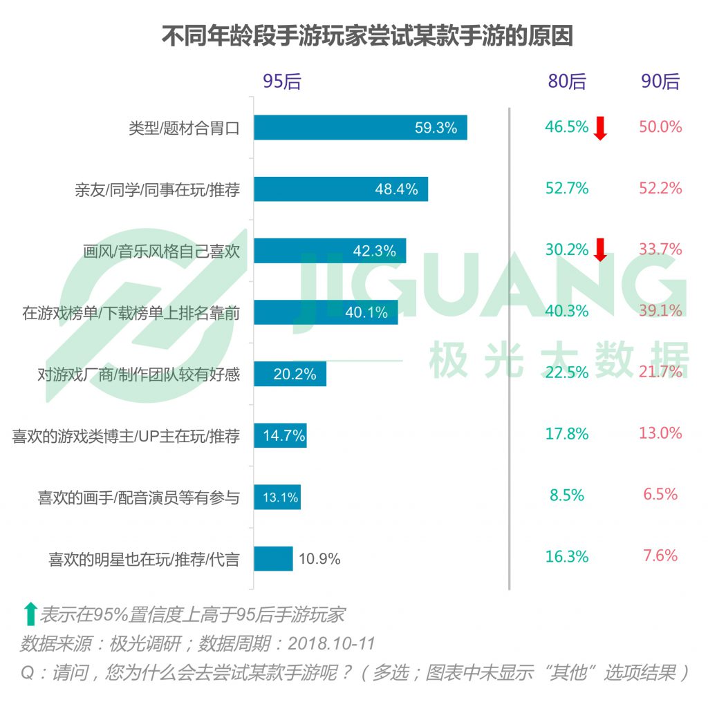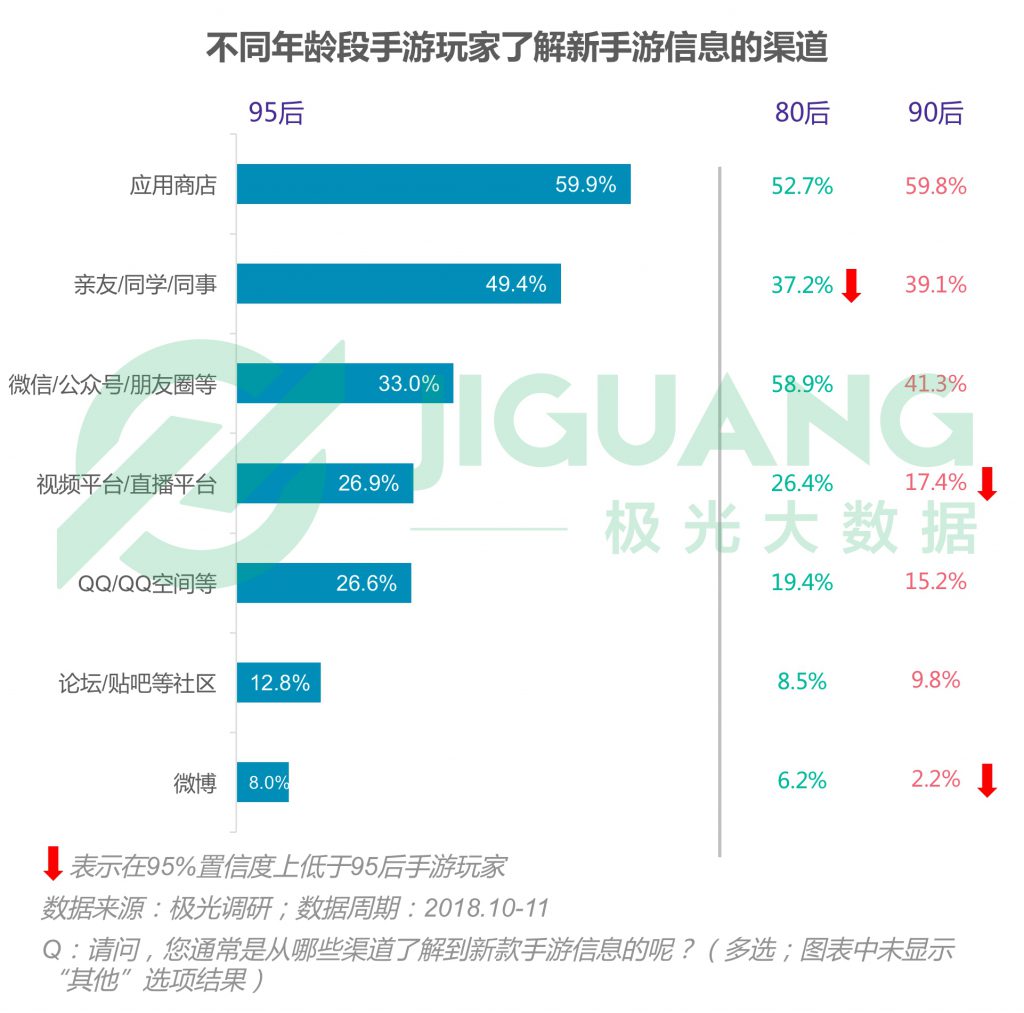 从极光大数据发布的《2018年年度手机游戏行业研究报告》来看,不同年龄段玩家尝试新游的原因各不相同。年轻的95后更多是由于题材类型、画面音乐等产品特点,而80后玩家的选择则是取决于好友推荐;更有意思的是,80后玩家了解新游的渠道反而更多来自应用商店,好友推荐的比例甚至低于95后用户。