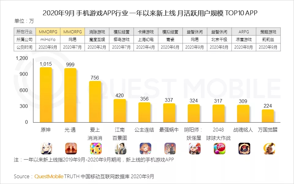 与以往80后主导下的市场表现不同,在《报告》透露的9月手游行业上线新品MAU排名TOP10中,除了休闲游戏仍是热门类型外,几乎都是迎合年轻人喜好的精品游戏。既有二次元品类的《原神》、《公主连接》、《阴阳师:妖怪屋》;也有创意向产品的《光遇》、《江南百景图》、《最强蜗牛》、以及《战魂铭人》;就连唯一入选的策略手游《万国觉醒》,同样也是年轻人喜爱的全球化的欧美卡通风格。