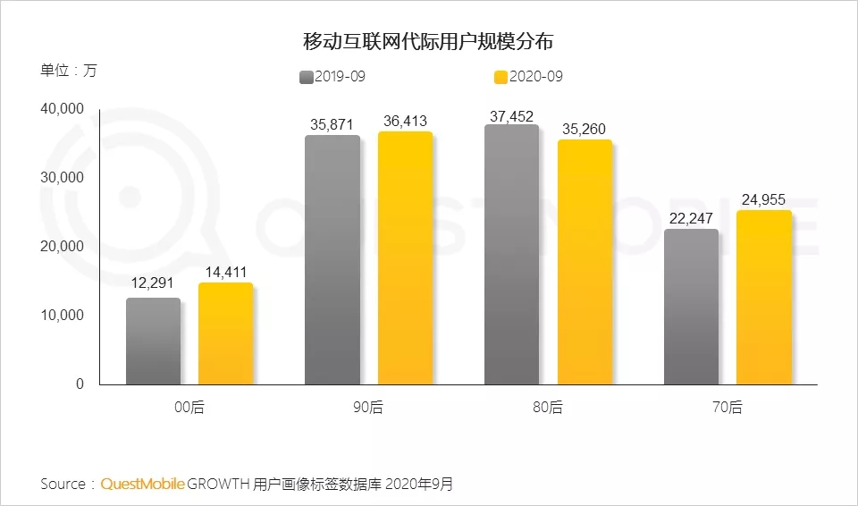 近日,QuestMobile发布《2020中国移动互联网秋季大报告》(以下简称报告)指出,移动互联网生态到达重要转折点,即移动互联网人群结构发生巨大变迁,90后用户规模在今年Q3已达3.64亿人、而80后用户则为3.52亿,90后彻底蜕变为移动互联网的第一大主力军。