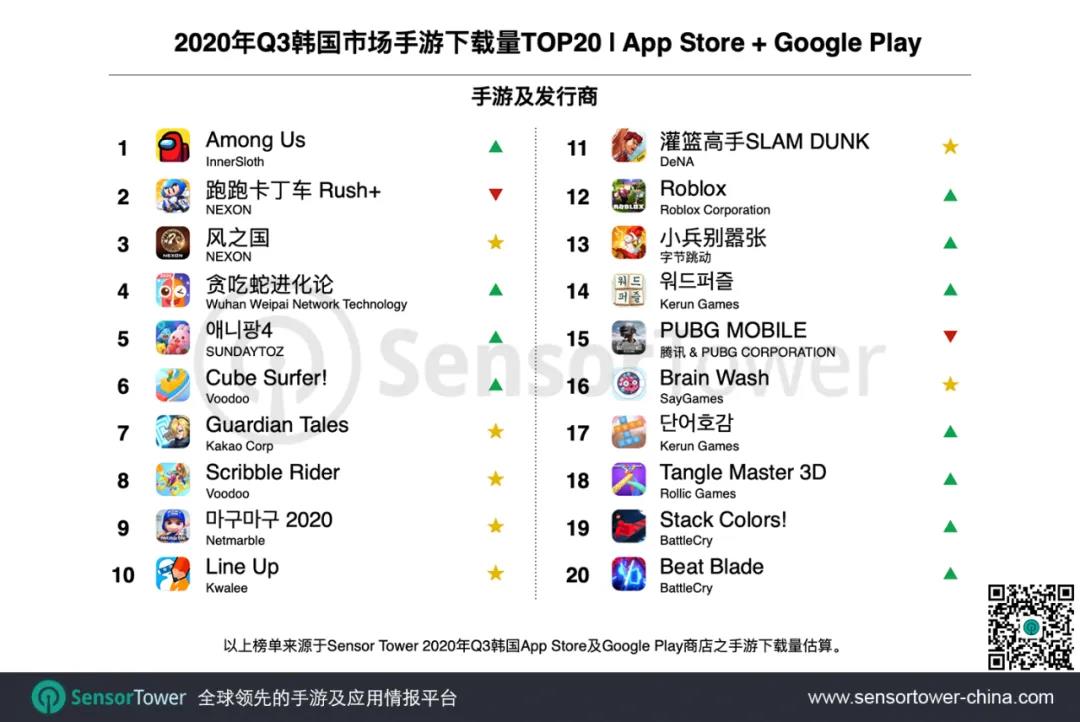 下载量方面,今年7月《Among Us》率先在韩国市场引爆,之后于8月底在全球多个市场掀起游戏热潮。Q3该游戏在韩国获得超过710万下载,刷新手游在韩国市场的吸量记录。上一个记录的缔造者是《PUBG Mobile》,2018年Q2该游戏在韩国获得560万次下载。