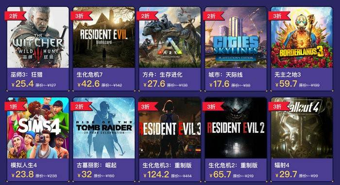 在这次的黑五促销活动中,许多广受好评的游戏开启了促销活动,其中:《模拟人生》1折促销仅需23.8元;《巫师3:狂猎》2折促销仅需25.4元;《生化危机7》3折促销仅需42.6元;《古墓丽影:崛起》2折促销仅需32元;《生化危机3:重制版》3折促销仅需124元;《生化危机2:重制版》3折促销仅需65.7元;《无主之地3》3折促销仅需59.7元。