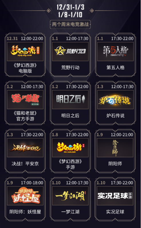 自11月12日网易电竞NeXT2020冬季赛的战号吹响以来,广大玩家和各支战队参与电竞盛宴的热情便不断高涨。经过50天的线上对决之后,12款游戏的线下总决赛巅峰之战即将在12月31日正式开启,《梦幻西游》电脑版、《梦幻西游》手游、《阴阳师》、《决战!平安京》、《阴阳师:妖怪屋》、《第五人格》、《猫和老鼠》官方手游、《明日之后》、《一梦江湖》、《荒野行动》、《实况足球》、《炉石传说》等热门游戏赛事接连展开,无限畅想与昂扬斗志在这里闪烁碰撞,迸发出电竞精神的绚烂花火!