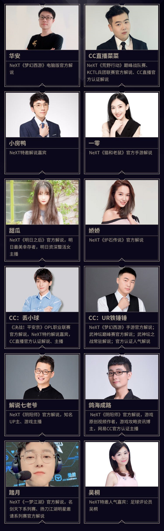除了能够享受各路精英带来的赛事盛宴之外,此次线下赛现场还邀请到了多位超人气明星解说领衔助阵:知名《阴阳师》解说七老爷、鸽海成路,特邀足球评论员吴桐,还有小房鸭、甜瓜等等。他们既有丰富的解说经验与高超的解说技巧,又具备极富专业性的比赛分析视角和亦庄亦谐的解说风格,总决赛现场有他们的倾情加盟,相信将会为我们呈现更多精彩内容。这场汇聚游戏热爱者的狂欢嘉年华,势必会在现场持续升温!