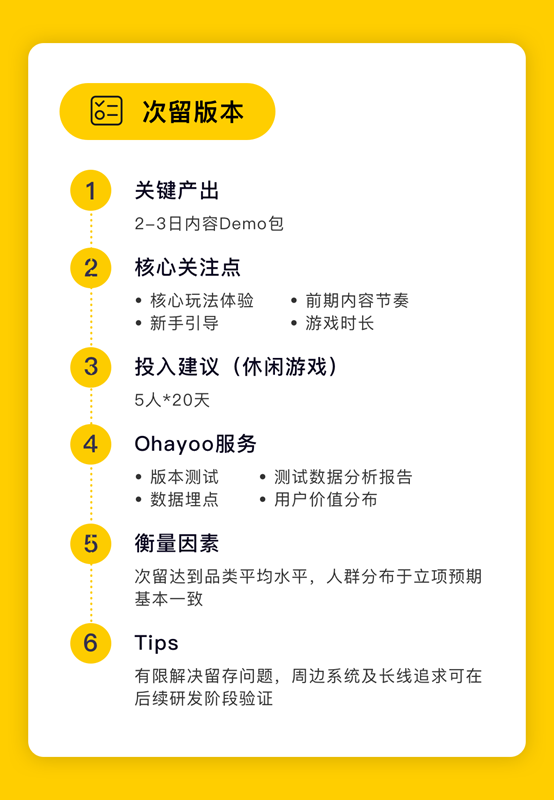 产出2-3天内容的版本,接入SDK可上线进行测试,此阶段主要测试玩家对核心玩法的接受度,周边系统可暂不添加。