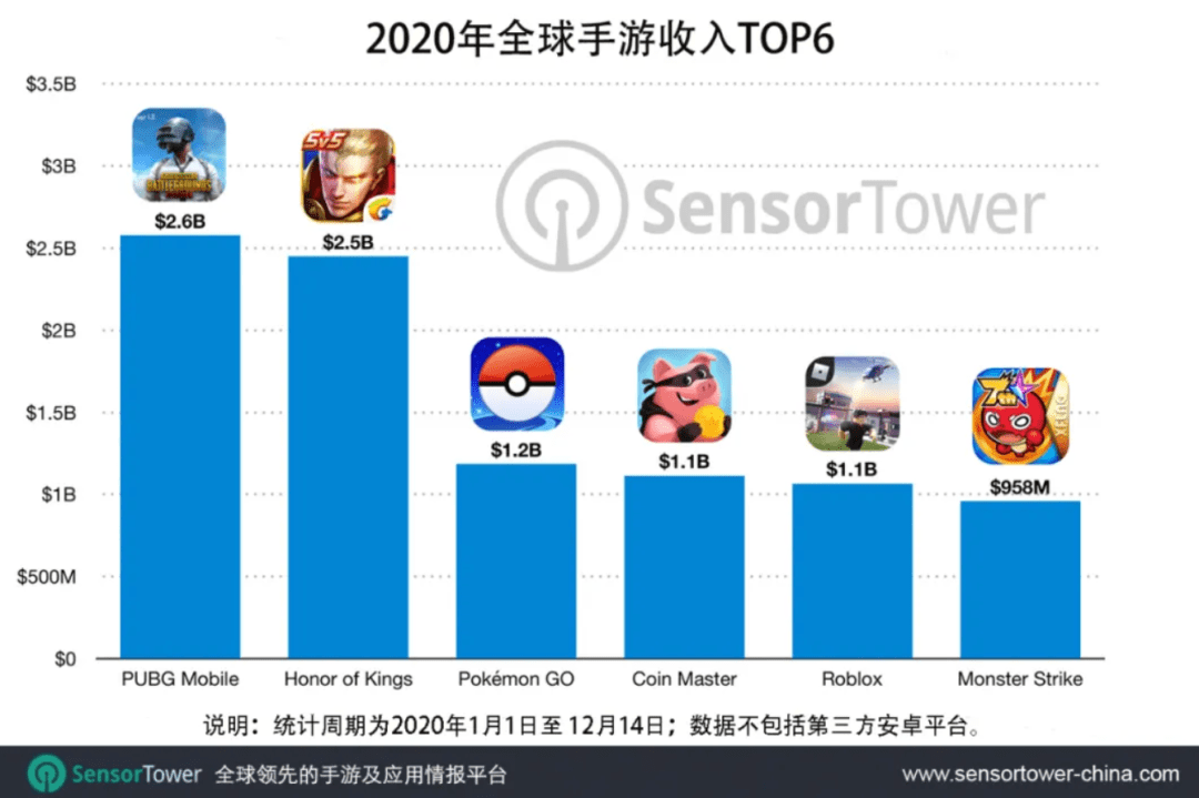 近日,移动应用数据分析公司Sensor Tower公布了2020年收入最高的6款手游产品,其中有5款手游的年收入已经超过了10亿美元,跻身“十亿美元俱乐部”。