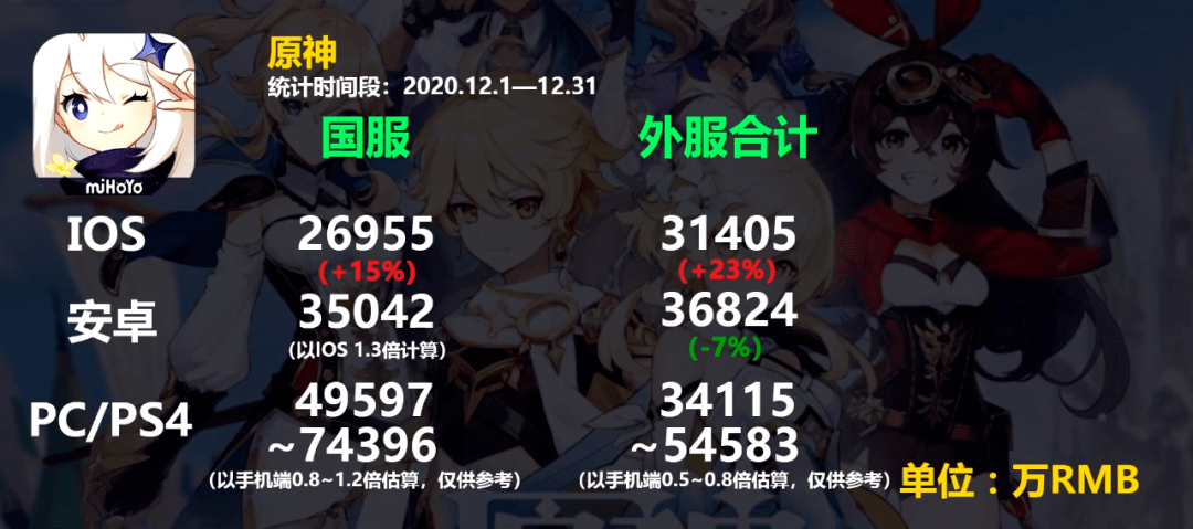 截至2020年底,《原神》仅移动端的收入就已达到5.6亿美元。值得一提的是,12月日本市场以4960万美元的收入首度超过国内iOS平台的收入(由于中国安卓平台的收入不好估算,各数据机构一般无视)。