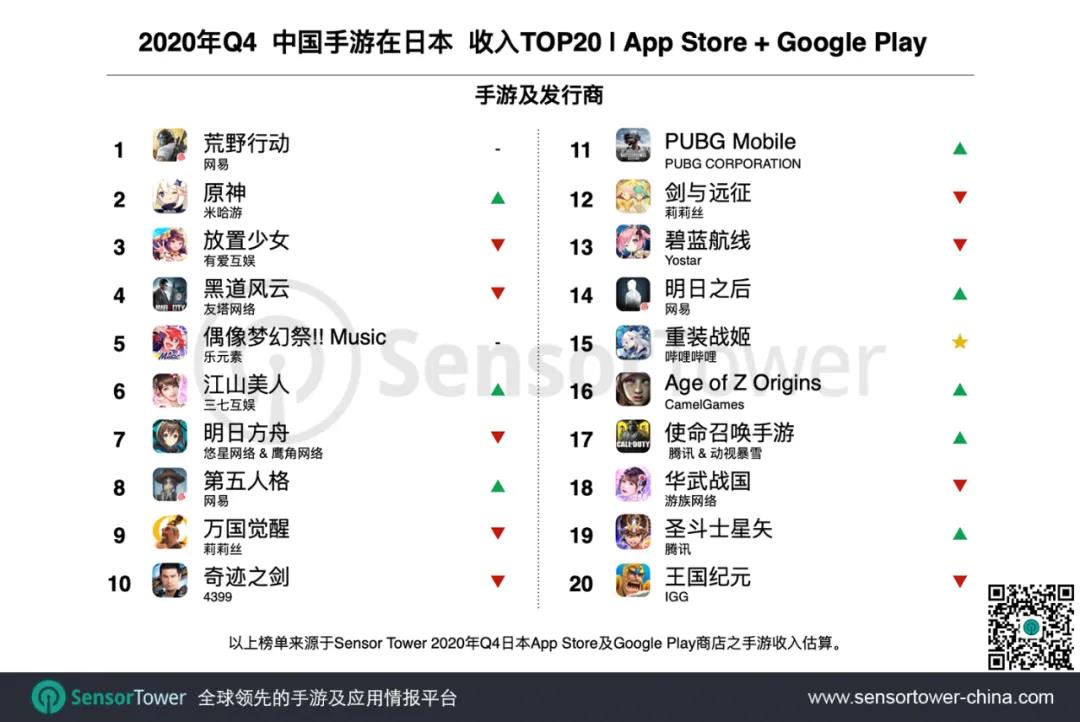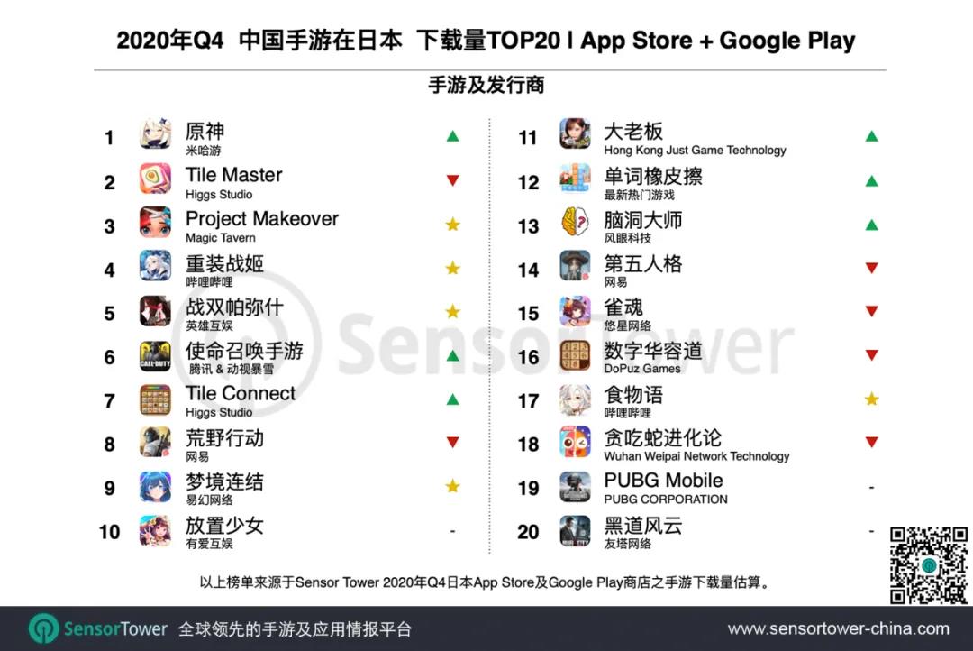 Sensor Tower 商店情报最新数据显示,2020年Q4日本手游市场收入超过46亿美元,同比增长34%。入围畅销榜Top100的中国手游数量进一步增加至30款,拿下27%的市场份额。详细数据如下。