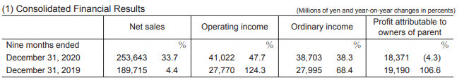 整体数据方面公司净销售额为2536亿日元,同比增长33.7%;营收为410亿日元,同比增长47.7%;普通收入387.03亿日元,同比增长38.3%;母公司持有者利润为183.71亿日元,同比下降4.3%。