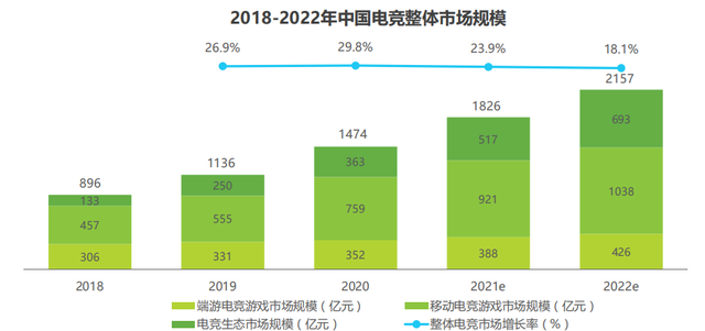 近年来,电竞产业发展十分迅速,市场规模、用户量级及大众影响力都得到了持续提升。根据艾瑞咨询《2021年中国电竞行业研究报告》显示,2020年中国电竞整体市场规模超过1450亿元,预计2021年将突破1800亿元。
