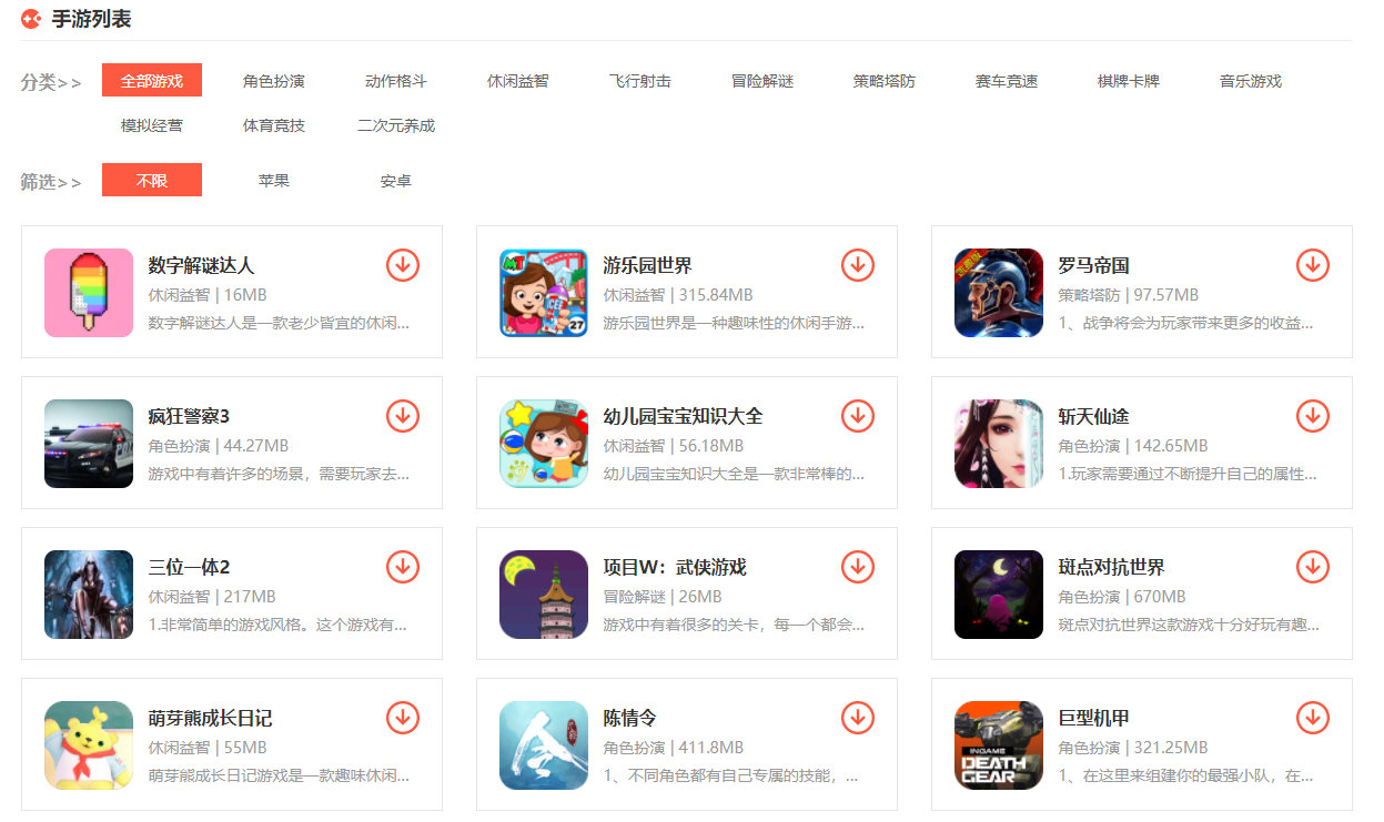 2.手游下载:左边下载与52下载为广大安卓用户与IOS用户提供了丰富的手游库存,对各大游戏进行明确分类,角色扮演、体育竞技、模拟经营、音乐游戏等栏目。玩家们可以轻松找寻想玩的手机游戏。