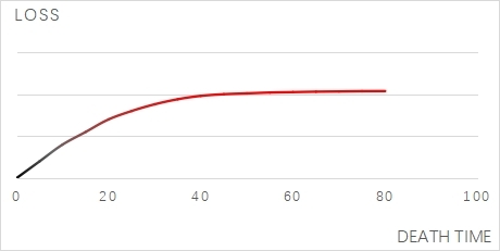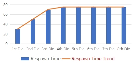 最终的复活时间如图所示,我们决定将玩家的死亡次数作为影响玩家重生时间长度的唯一变量。换句话说,每死亡一次,都会延长下次的复活时间,这种压力使得局势更加的紧张和刺激。玩家必须非常谨慎,并且随着玩家的死亡,节奏也会发生巨大的变化。但是如果时间太长,玩家会在死亡的时候非常无聊,因此我们设定了时间上限,这是游戏机制和用户体验之间的权衡。