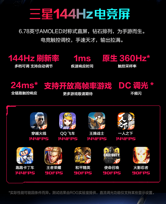 为让强悍游戏性能带来的高帧画面疾速呈现,腾讯ROG游戏手机5S全系标配三星AMOLED 电竞屏,拥有144Hz刷新率与1ms响应时间,最高每秒可显示144幅画面,带给玩家流畅无拖影的视觉体验。而360Hz的原生触控采样率,更是让触控操作顺滑无比,为决胜手游战场平添助力。