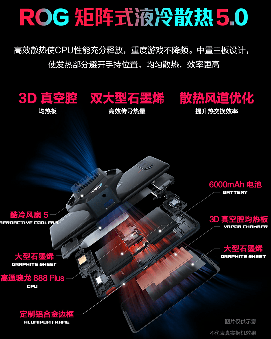 而且,腾讯ROG游戏手机5s内置矩阵式液冷散热架构5.0,内部布局以3D真空腔均热板与双大型石墨烯实现散热效果的提升,为高通骁龙888 Plus 5G移动平台快速降温,保证玩家长时间激烈作战时,仍能稳定维持游戏帧率,畅快游玩,杜绝画面卡顿。