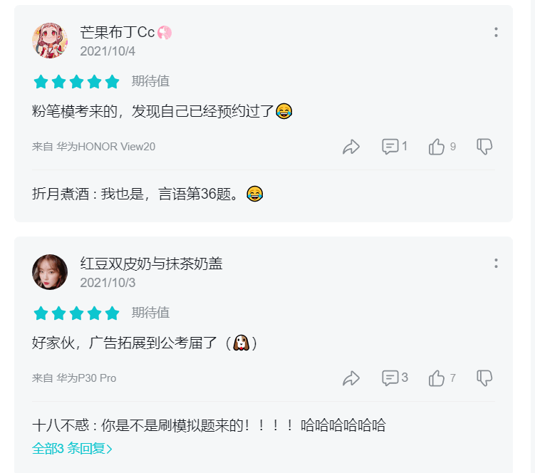 但在前几天,游戏的评论区里突然多了几条意外的评价:有几位网友表示自己做考公模拟题的时候,突然发现有一个题目居然和游戏有关,就顺藤摸瓜关注了过来,还在评论区找到了一起刷模拟题的同好。