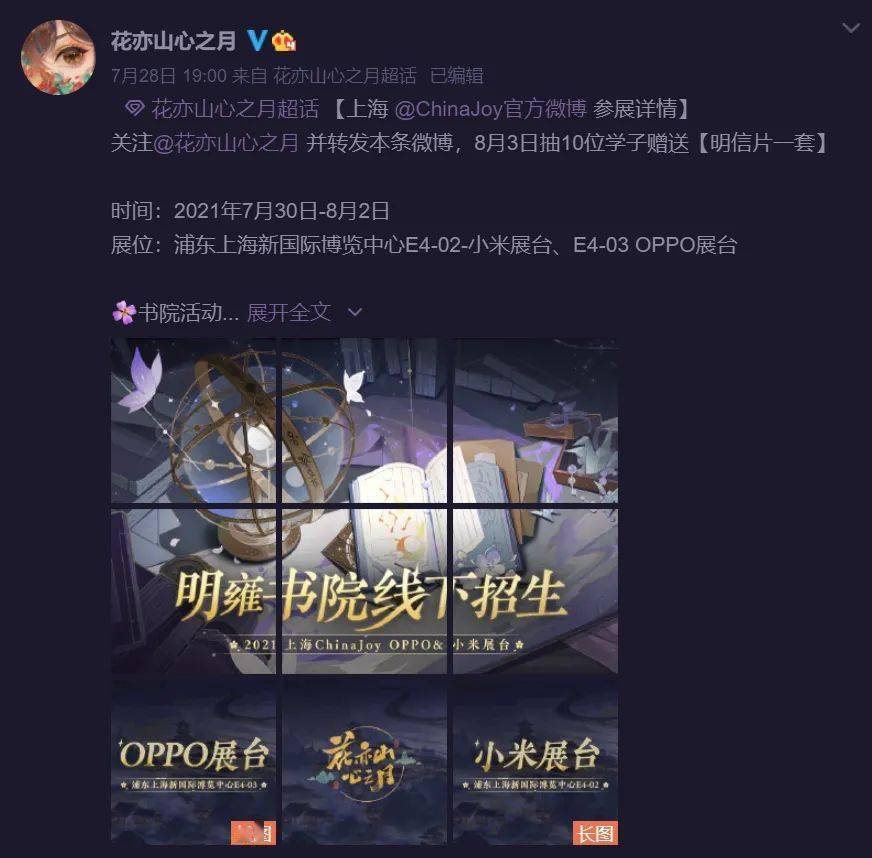 早期通过极具形式感的皇家书院招生PV、招生函等方式,在市场初步建立了“高颜值国风书院形象”,并经由线下实体漫展的高颜值还原展示,强化了这一印象。再徐徐围绕这一初印象,不断释放游戏IP世界观概念,确定游戏美术标签,频繁与玩家互动,还邀请了多位国风、古风大师及团队,打造其原创国风内容,传递古风古韵之余,逐渐构造出了其特色的原创IP世界雏形,聚集沉淀了可观的游戏核心受众。而这些持续耕耘的强贴合市场经营也为《花亦山心之月》公测期间的营销爆发提供了坚实基础。