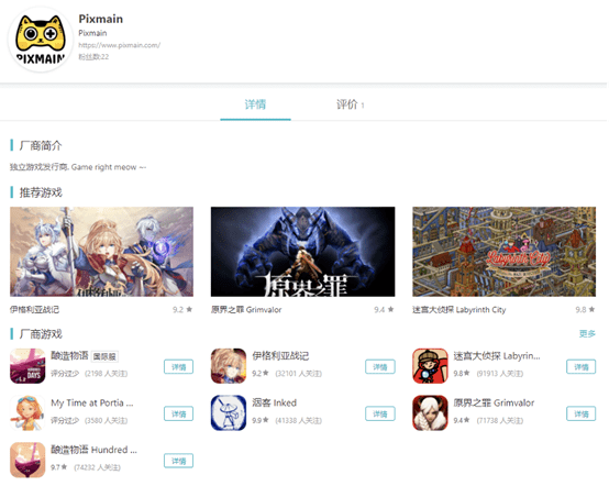 除了《原界之罪》未登陆Steam,Pixmain旗下的其它几款产品的发行情况也基本类似,都包括了移动游戏平台和PC端平台的发行,其中《迷宫大侦探》还登陆了Switch,这种多平台发行模式更有利于独立游戏的成长。从Pixmain签下的作品的团队来看,能够查到的Inked团队共6个人,《伊格利亚战记》差不多在6人左右,《酿造物语》的团队为5个人等等,所以在这些小团队下,无论是国内的产品走向海外,还是海外的产品引进到国内,并以一种多平台发行的模式走到玩家面前,Pixmain可谓是功不可没,这也很好的考究了Pixmain专业能力与资源优势的结合。