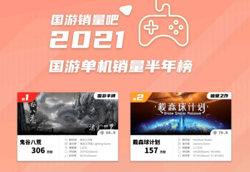 而到了2021年,国产单机市场仍然还在增长,且经过前几年的经验积累,逐渐摸到市场规律的单机市场在今年又迎来了一波小爆发——一边是《鬼谷八荒》、《戴森球计划》破纪录新作的来临,一边是《枪火重生》旧作销量继续增长破200万,《光明记忆:无限》、《天命奇御2》、《仙剑奇侠传七》等IP续作再引热议,与此同时还有多个大厂投资、《黑神话:悟空》的项目推进与腾讯、米哈游等旗下工作室3A大作立项的未来展望。